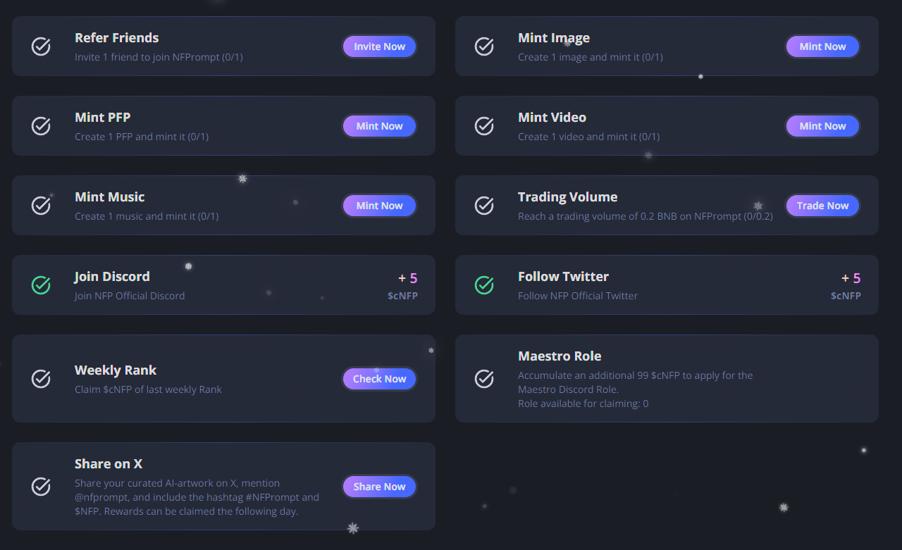 4.거래량: NFPrompt의 활기찬 시장에 참여하고 NFT를 거래하세요. 이 활동을 통해 가장 많은 크레딧을 얻을 수 있습니다. 그러나 공정성을 보장하고 시스템의 잠재적인 도박을 방지하기 위해 일일 최대 BNB 거래량 한도는 3입니다.